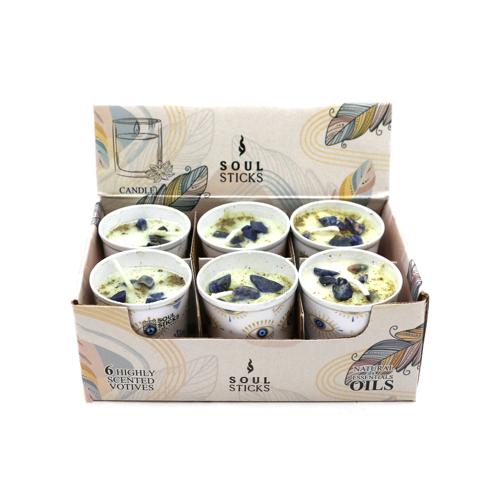 2.3 oz. Enchanted Elixir Scented Votive Candle. MADE IN INDIA with 100% Soy Wax, Lead Free Wicks, Organic Herbs & Lapis Lazuli Crystals BURN TIME - 12 HOURS