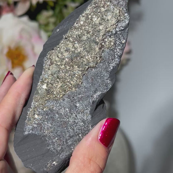 Pyrite on Shungite brings together two deeply supportive energies: Shungite’s grounding and protective presence with Pyrite’s motivating, confidence-building strength. Together, they create a powerful combination for those who want to move forward with clarity, stability, and intention.