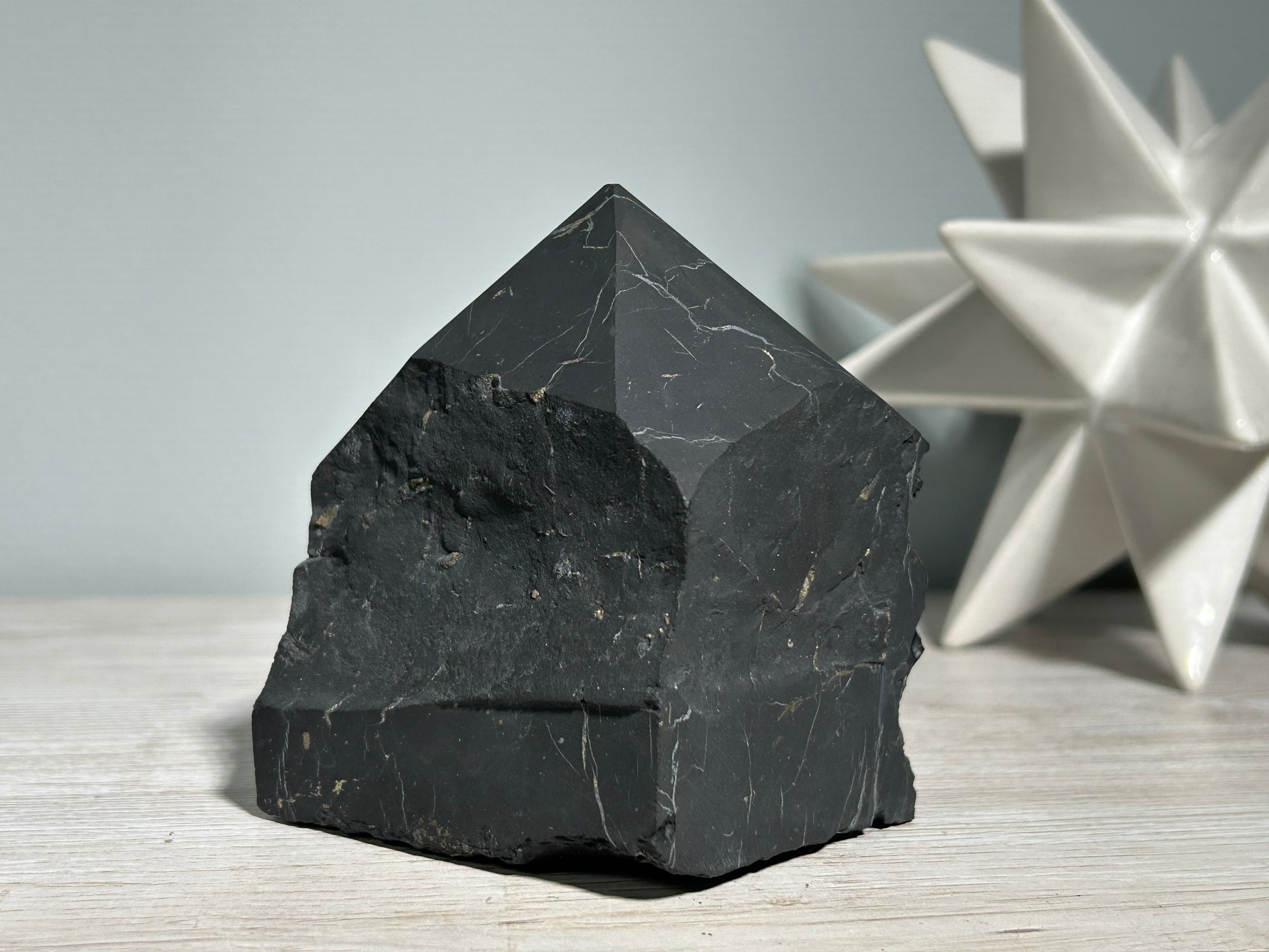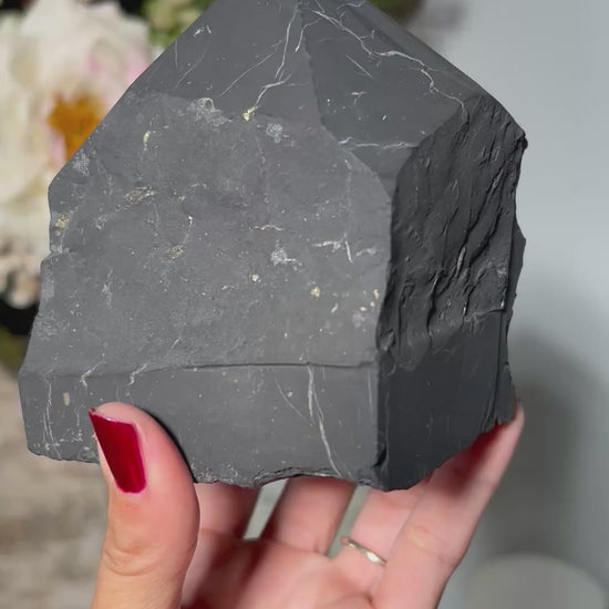 In tower form, Shungite’s energy is focused and directional, encouraging clarity, balance, and a steady sense of presence. Due to its size and weight, this piece works beautifully as a room anchor — ideal for meditation areas, workspaces, or EMF-conscious environments.