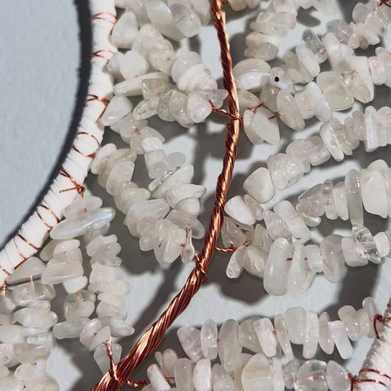 Measuring approximately 24 inches long, these dream catchers feature leather string, copper wire, crystal chip beads, and soft feathers, woven together in a flowing crescent moon shape. The Tree of Life at the center symbolizes growth, balance, and the interconnectedness of all things — anchoring the energy of the space it inhabits.